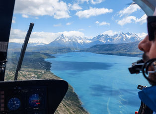 The journey unfolds, unveiling the timeless allure of turquoise lakes that punctuate the rugged Patagonian landscape. From the helicopter, witness these pristine water bodies, each a jewel in the rugged terrain. This unique vantage point allows you to savor the untouched beauty, a privilege reserved for the fortunate few.